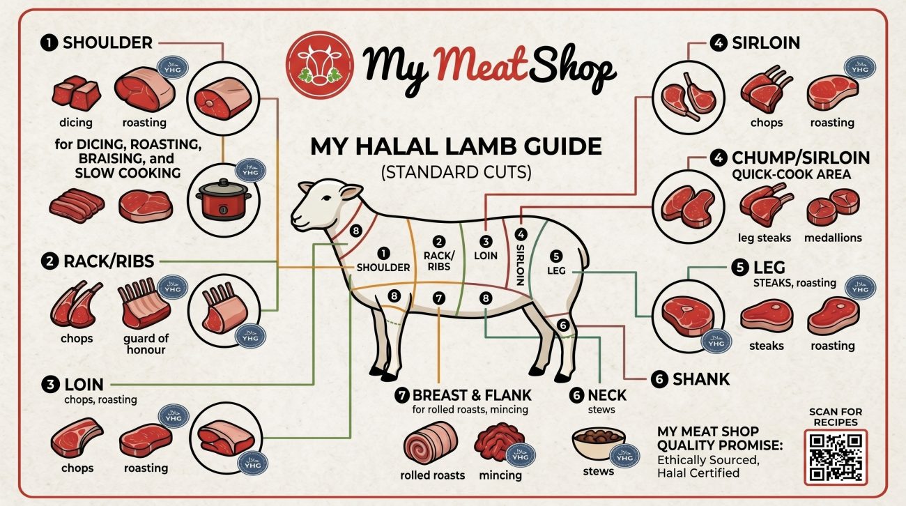 Halal Lamb Cuts Guide: Shoulder, Rack, Loin, Leg, Shank, Neck & Best Cooking Uses