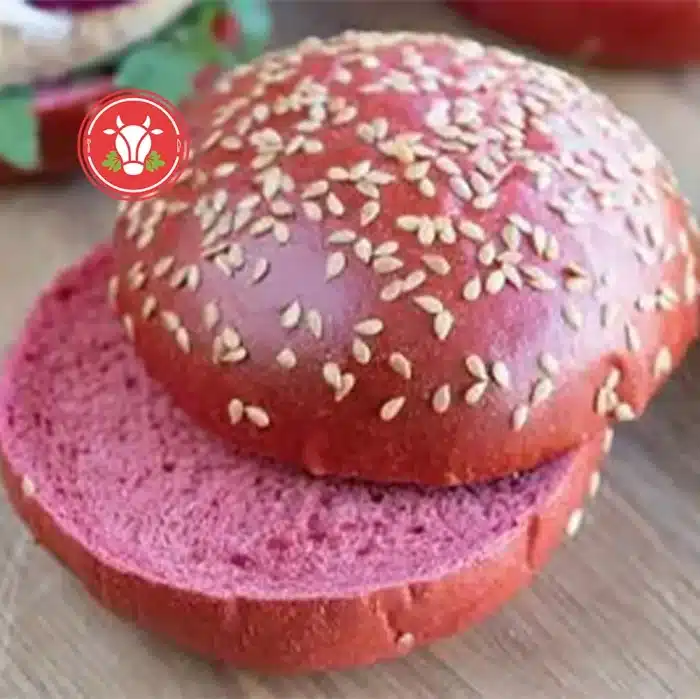 Naturally red beetroot burger buns topped with linseeds. Soft, pre-sliced, and ideal for gourmet or plant-based burger builds.