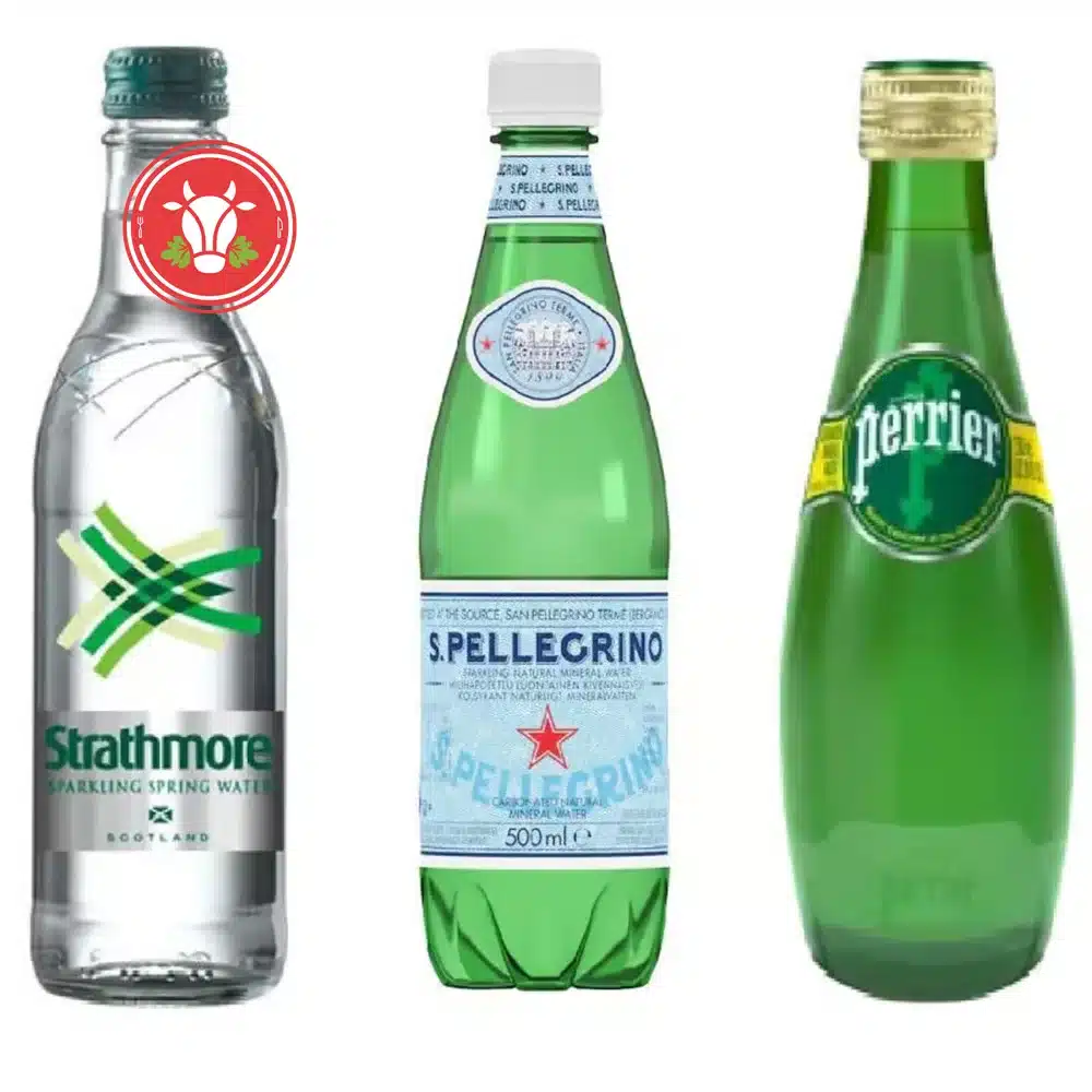 Light, refreshing sparkling mineral water – served in elegant glass bottles (Strathmore, Perrier 33cl) for premium table service and practical plastic bottles (San Pellegrino) for takeaway.